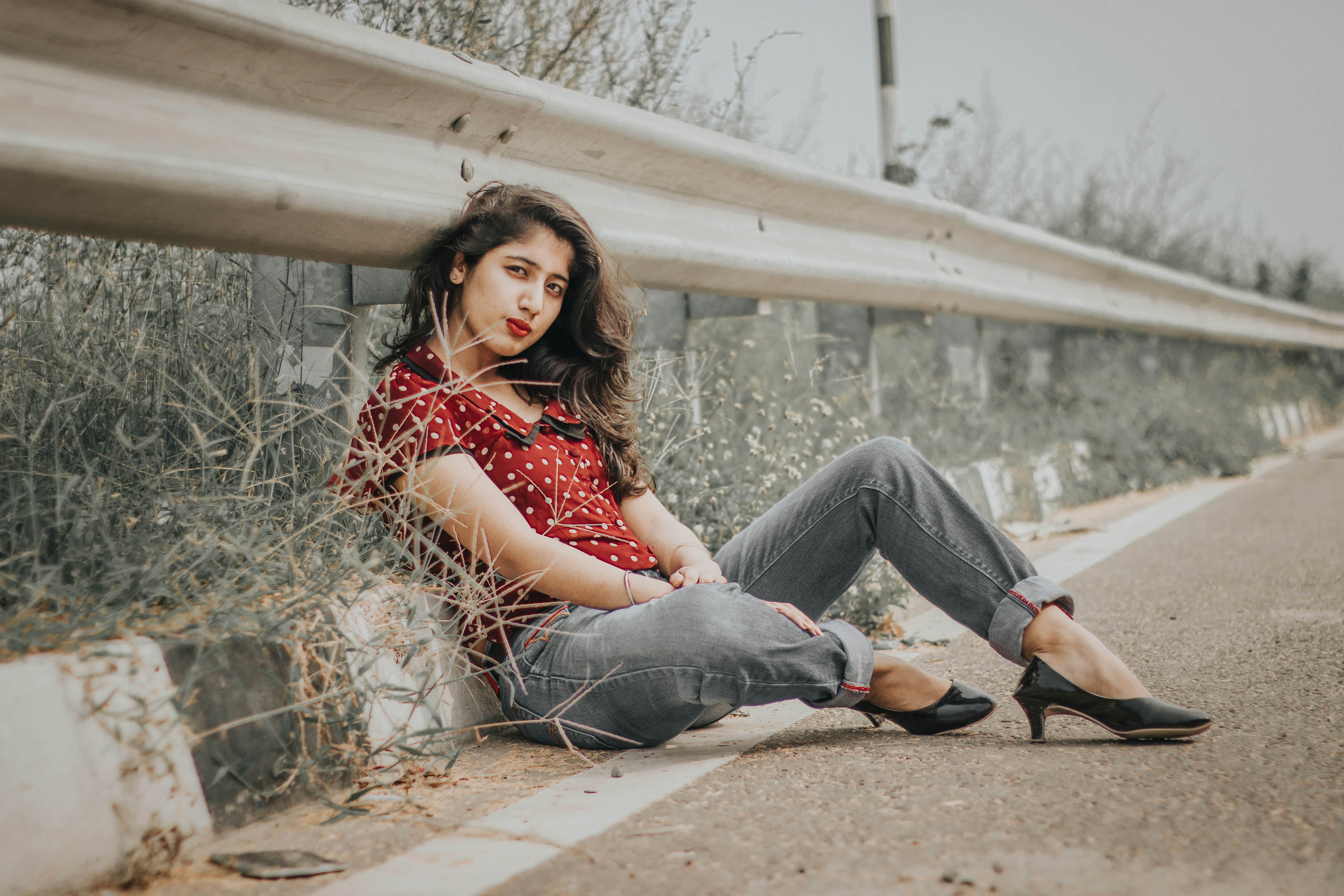 Woman In Red Dotted Shirt And Gray Denim Pants Sitting On Ground Near Road Rail Photo Free Apparel Image On Unsplash - Boy warriors from abangan dashing to the field.