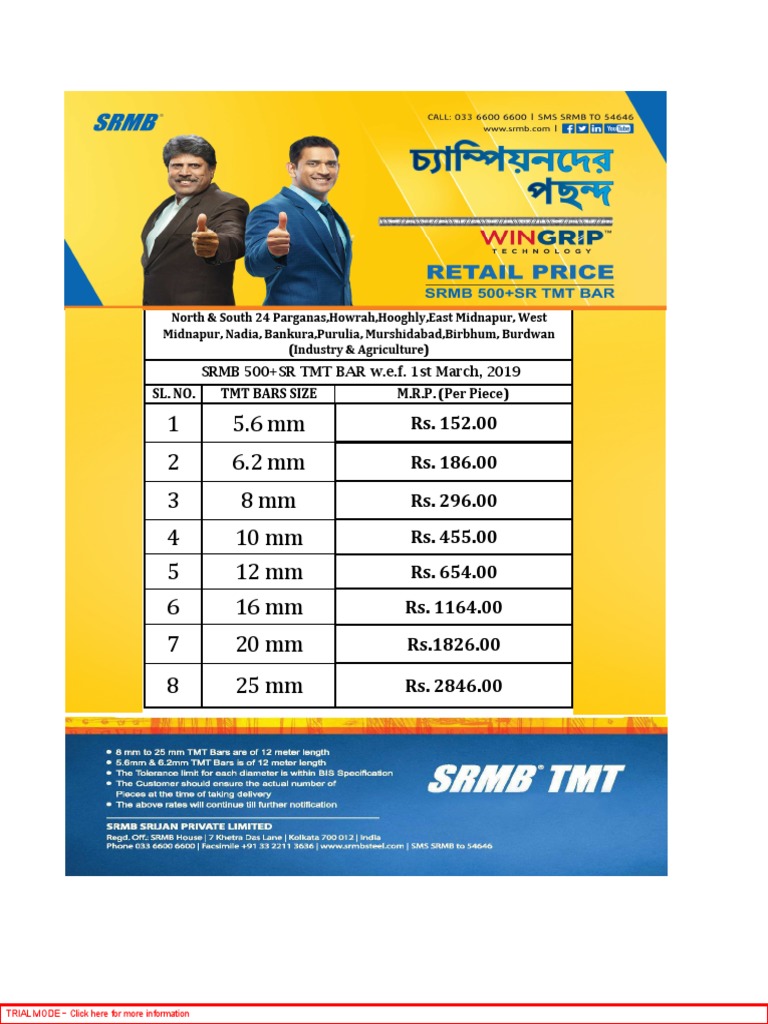 Mrp 1 - The best quality srmb tmt bar price is also very much competitive.